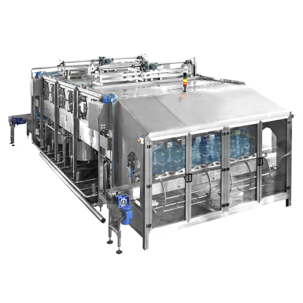 是五加侖桶裝飲用水生產線的主要生產設備;集自動上瓶、洗瓶、自動下瓶、自動出瓶于一體的新式機型;采用潔凈型墻板式結構、精確平穩的90度翻轉上下瓶子方式、衛生型U型 結構水箱、變頻控制全面沖洗等相結合,設備運行平穩,沖洗潔凈、全面維護方便,衛生等級高。適